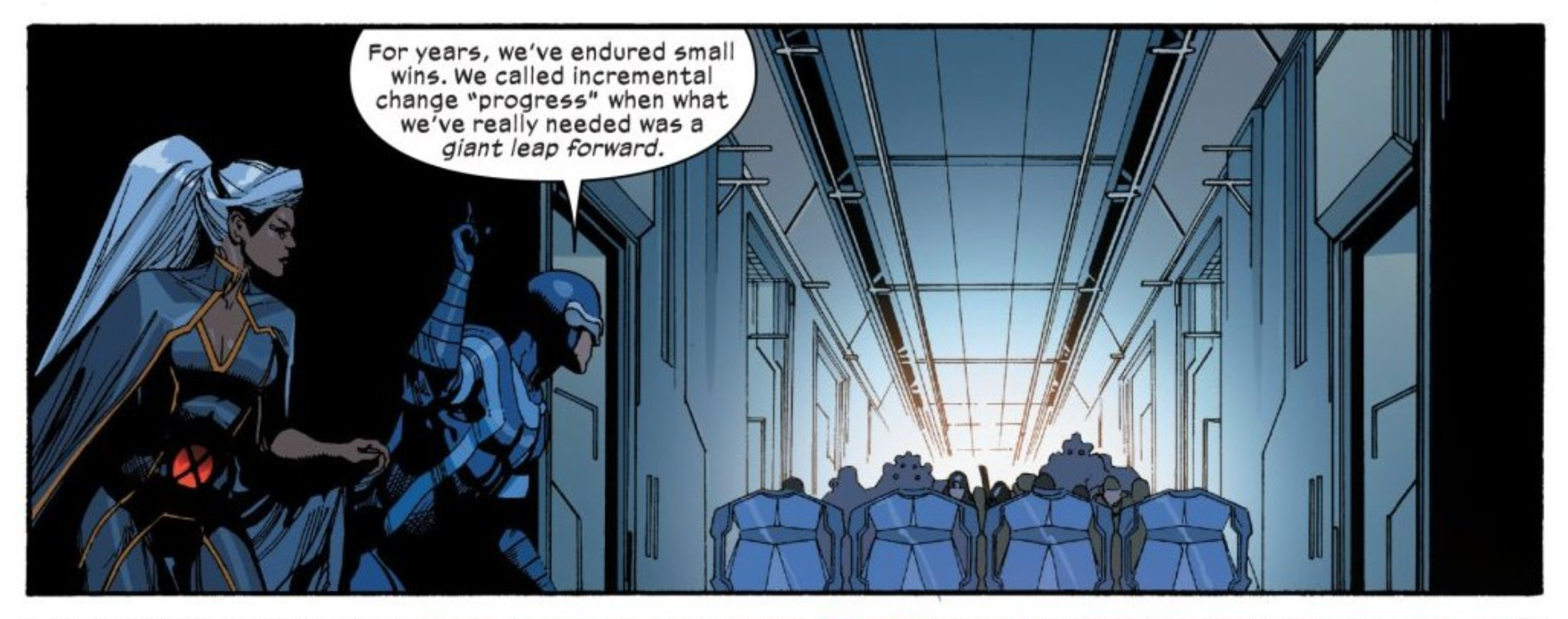 Hickman is relatively subtle in shading in Cyclops’ flaws, which mainly come down to his myopic idealism. His line early in the issue – “we called incremental change ‘progress’ when what we’ve really needed was a great leap forward” – resonates in a very earnest DSA sort of way, but the use of the phrase “great leap forward” comes across as Hickman nodding to the catastrophic failures of Mao’s Communist revolution that Cyclops himself is not fully considering. Later on he tells Polaris about how he felt when his son Nathan was born, and while his dialogue is certainly expressing his emotional truth, the reader (and Polaris) know very well that he’s telling a very simplified version of the story where he didn’t in fact make several huge mistakes. He yadda yaddas years of bad decisions and failures to arrive at a “because I believed in a thing, now it’s real” conclusion about the new Krakoa status quo, and Polaris asks him if he actually believes it. Of course he does! He’s Cyclops. He’s the best there is at what he does, and what he does involves monomaniacal focus and a lot of self-delusion.