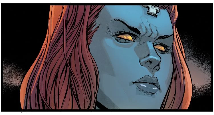 • The long-awaited confrontation of Moira, Mystique, and Destiny plays out in the same nine panel grid structure that Pepe Larraz used in House of X #2 and Valerio Schiti used again reprising that scene earlier in Inferno. Just as in that scene set in Moira’s third life, she’s captive and passive as Mystique and Destiny stand before her – the former glowering and aggressive, the latter still and inscrutable behind her metal mask. You watch Moira cycle through emotions – denial, defiance, bargaining, depression, acceptance – and we see that history has simply repeated. Despite any expectations we had going into this scene, it’s Mystique and Destiny confronting Moira about her desire to “cure” mutants.